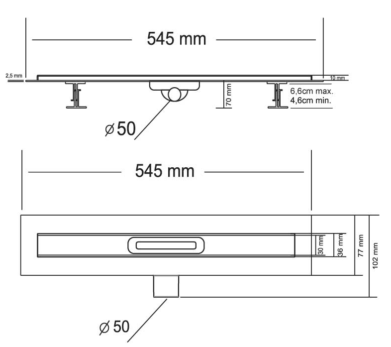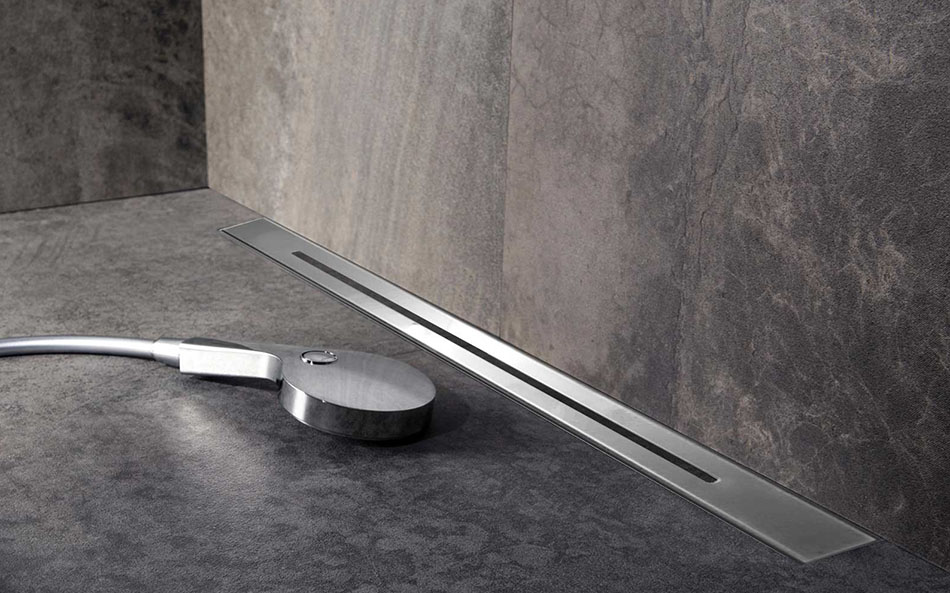 Поворотный сифон 360 градусов из ABS-пластика, дренажный канал из ABS-пластика, водонепроницаемые уплотнительные кольца, решетка и рамка из нержавеющей стали 1 мм, противозапаховый затвор, водонепроницаемая мембрана, пластиковый сервисный ключ, комплект регулируемых по высоте опор