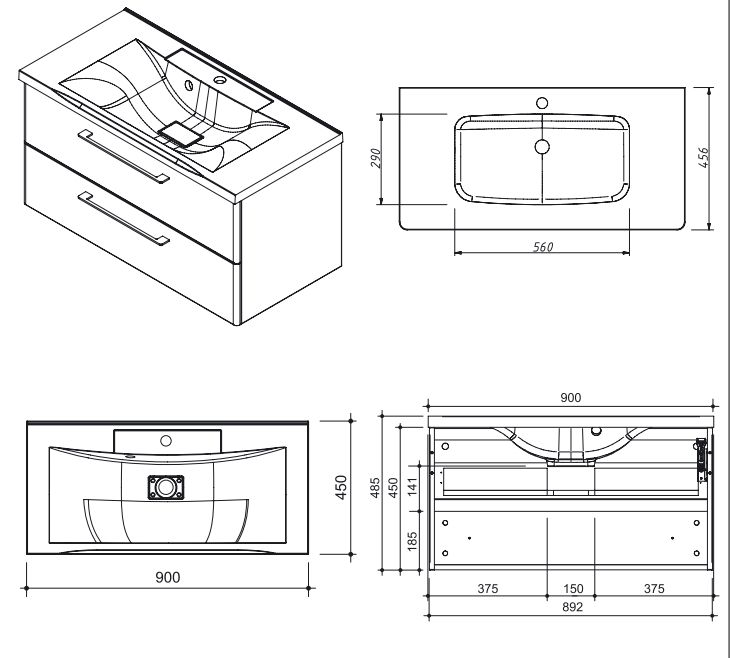 Тумба подвесная для раковины 90 см с 2 ящиками, производится под заказ в любых отделках из реестра"MODERN"
