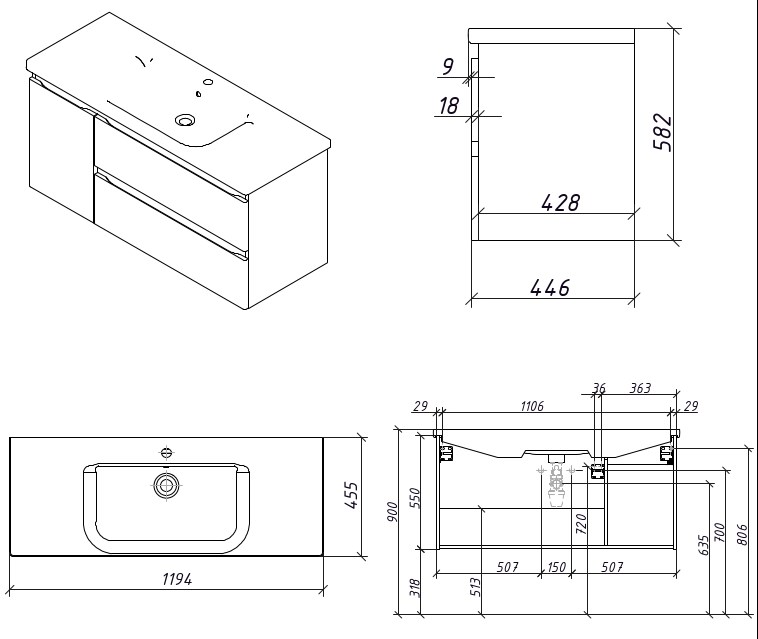Тумба подвесная для раковины 120 см с 2 ящиками и 1 дверью (слева). Ручки интегрированные в фасадах. Выпускается в Матовых и Текстурированных отделках из реестра MODERN (ограничение по глянцевым отделкам).